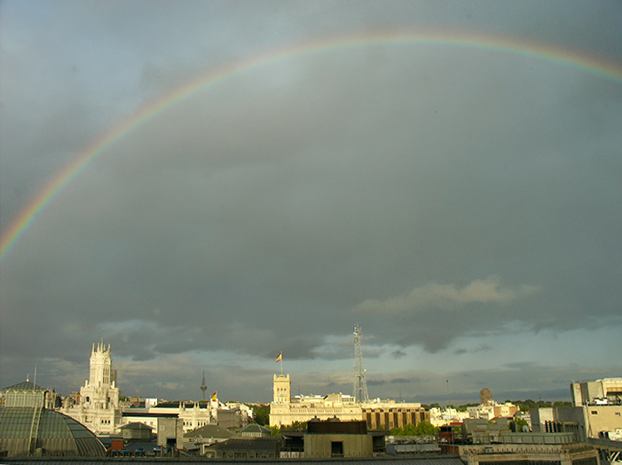 Al terminar la tarde, después de la cuarta (¿o era ya la sexta?) copa de vino y acompañados por un arcoíris doble que se podía ver desde los grandes ventanales del edificio, escuchamos el concierto de El último vecino. Grupo de Barcelona al que venía persiguiendo desde hace tiempo pero no había podido cazar en ninguno de sus conciertos por Madrid.