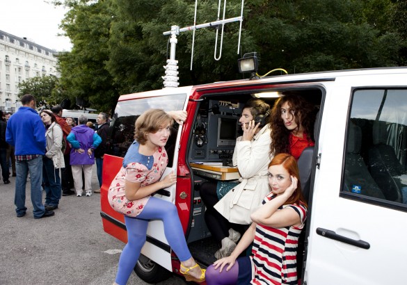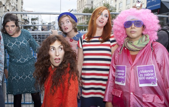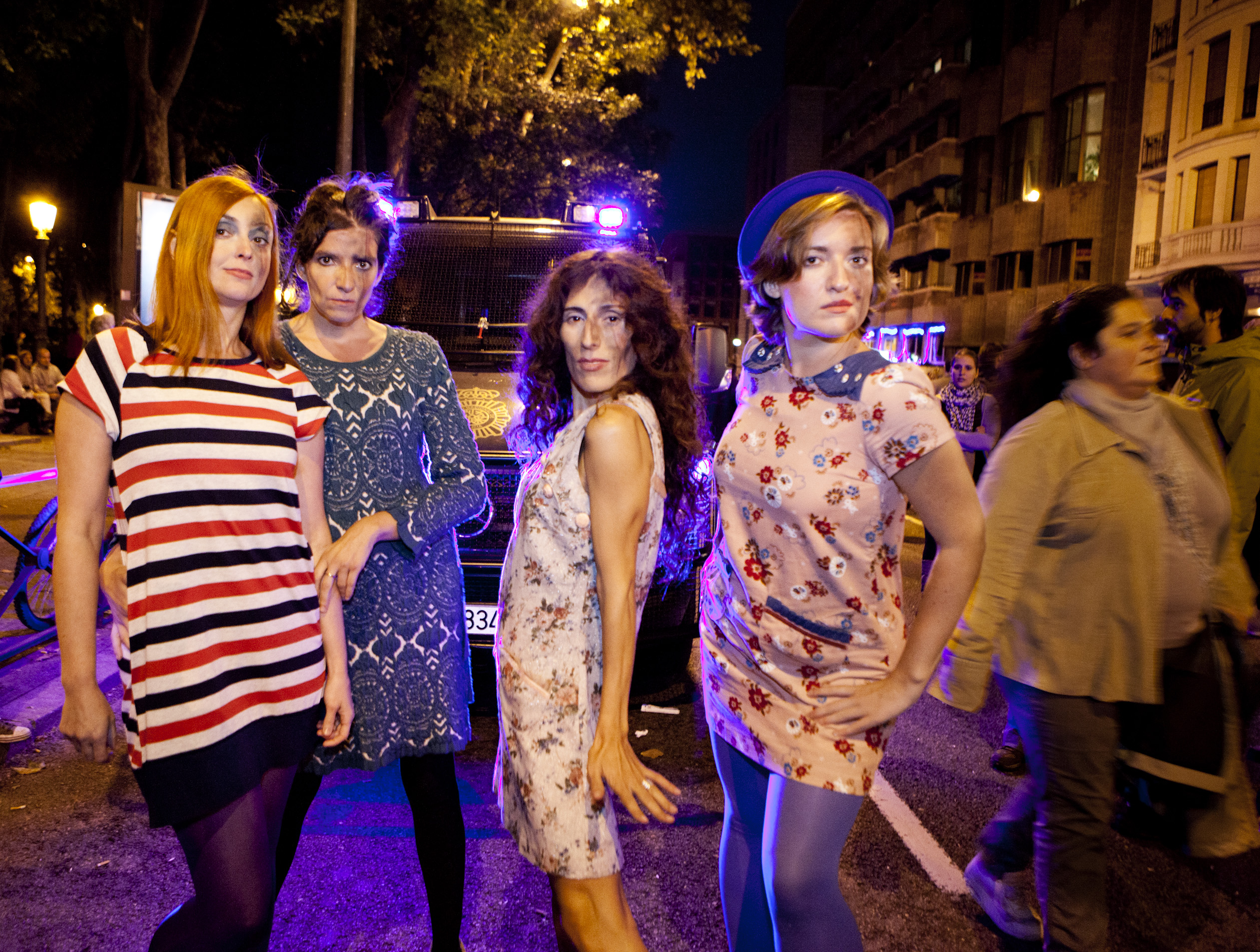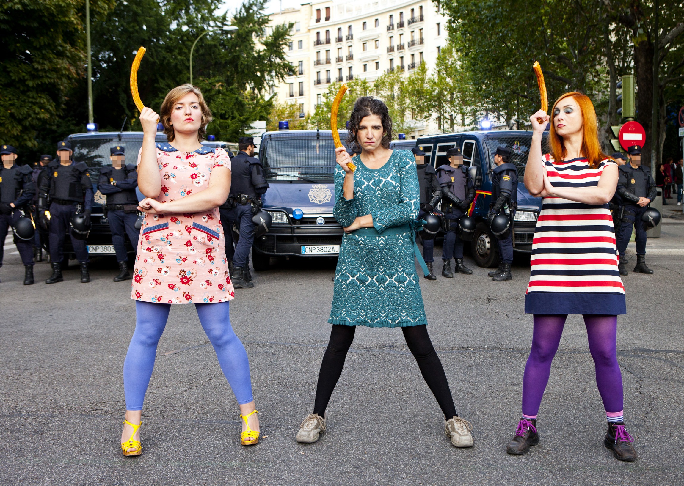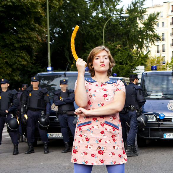 Personajes retratados en un entorno en el que no terminan de encajar del todo. Y la mezcla de moda y protesta fue un estímulo demasiado fuerte como para resistirse a plasmarla en una sesión que maneja la ironía con un tono descarnado y provocador.
