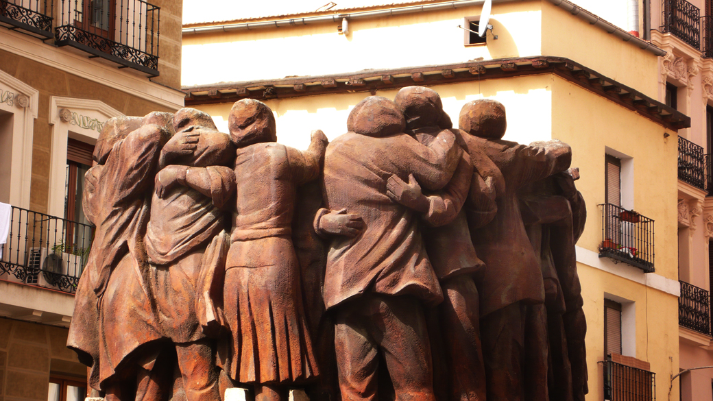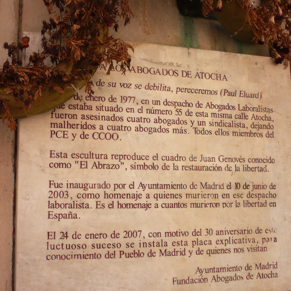 En la Plaza de Antón Martín hay un monumento, El Abrazo, dedicado a los Abogados de Atocha con resecas coronas de rosas